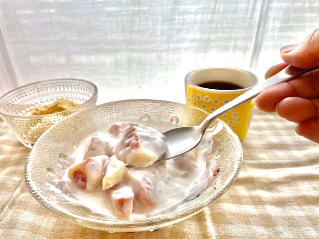 できればこの時食べる物は、好きな物を食べてください。私のパワーチャージ食は、フルーツです。バナナを直に食べるのと、切ってきな粉と黒蜜を垂らして食べるのでは、満足感が違います。イチジクも、蜂蜜とレモン汁とヨーグルトをあえてガラス皿に盛り、好きな色の布を敷いて食べるだけでテンションが上がり、充実感があります。
